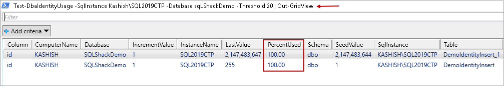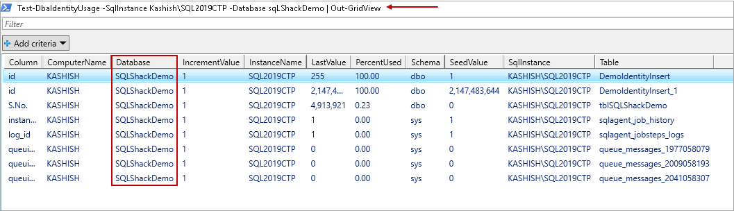 >Test-DbaIdentityUsage -SqlInstance Kashish\SQL2019CTP -Database sqLShackDemo -Threshold 20 | Out-GridView |