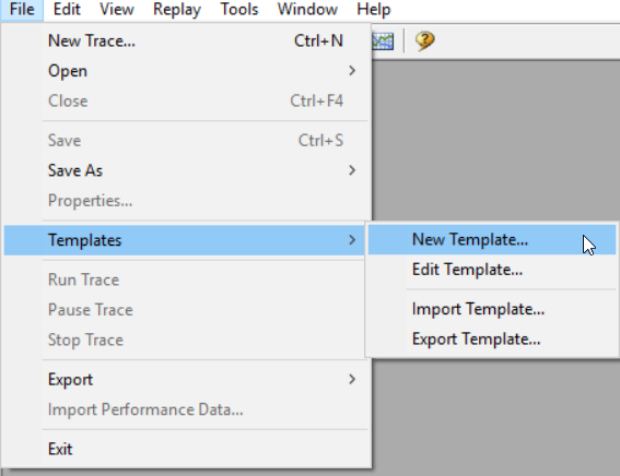 For example, to audit the events of adding the server logins and the database users on a SQL Server instance, you can edit the events of an existing template, or add a new template that you can use it directly for SQL Server audit purposes. To add a new template, choose the New Template option from the Templates list of the File menu, as shown below: