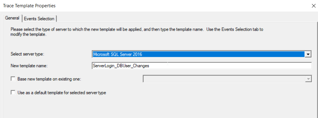 In the General tab of the New Template, choose the type of the SQL Server on which this template applies to and the name of the customized name, as below: