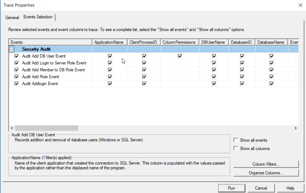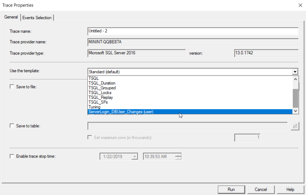 From the Events Selection tab, you can review the default events and properties of that custom template, and add a filter to trace a specific database, server or user. Click on the Run button to start the session, as shown below: