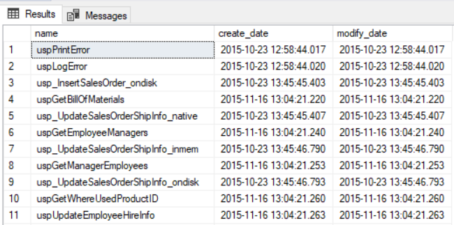 SELECT name, create_date, modify_date FROM sys.objects WHERE type = 'P' GO