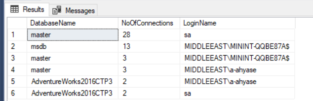 SELECT db_name(dbid) AS DatabaseName, count(dbid) AS NoOfConnections, loginame as LoginName FROM sys.sysprocesses WHERE dbid > 0 GROUP BY dbid, loginame order by NoOfConnections desc