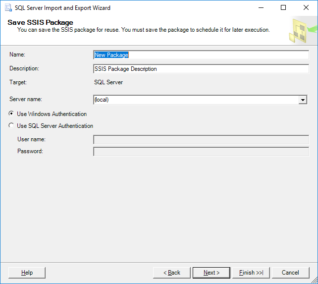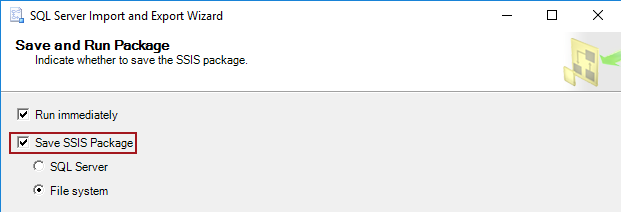 By default, the Run immediately option for the import and export data immediately is checked. To save the settings as the SSIS package, the Save SSIS Package check box needs to be checked.