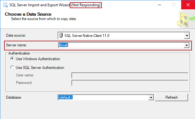 Note: If you are work with multiple servers or on a network, it is better to enter the name of the server instead to expand the combo box, because it may take a long time to list all available servers and it can cause the Not Responding state: