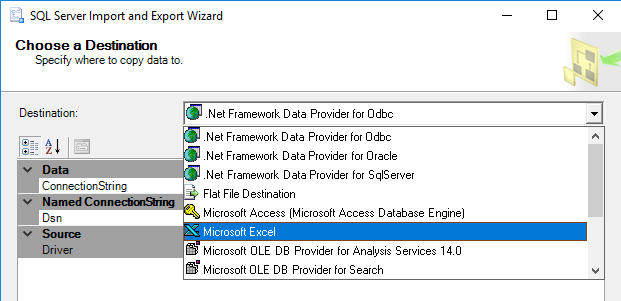 For the purpose of this article, the Microsoft Excel provider will be selected in the Destination combo box for importing data to the Microsoft Excel file: