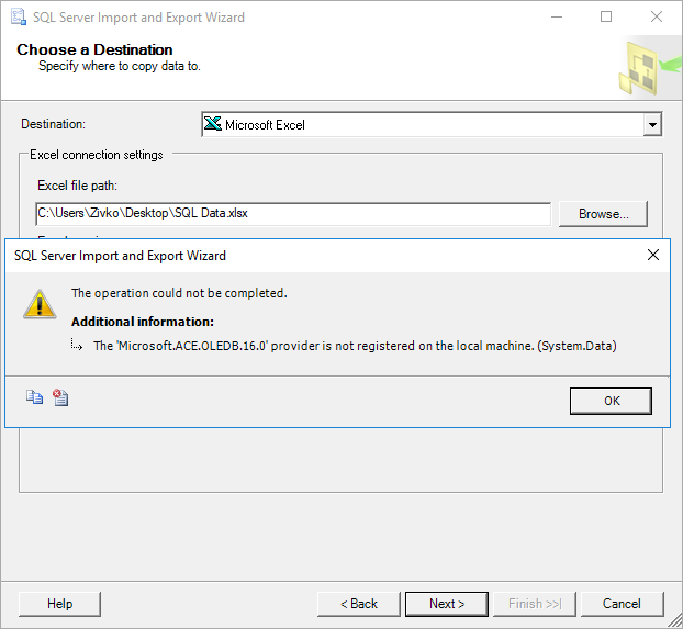 - For the destination on the local machine: C:\Users\Zivko\Desktop\ExportData.xlsx