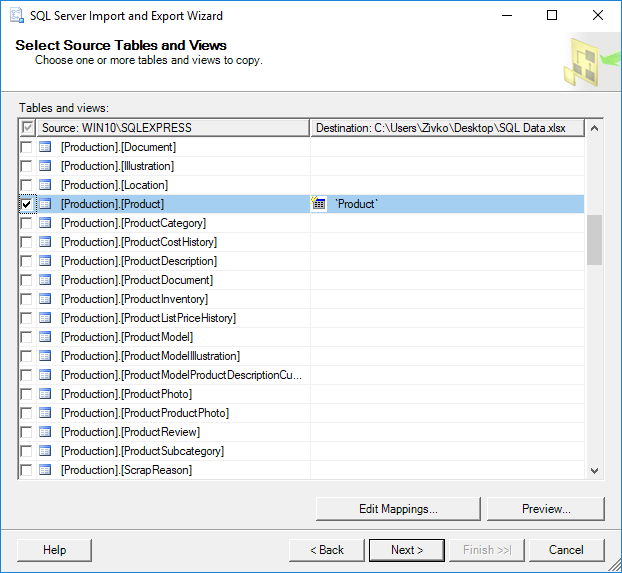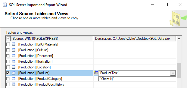 If the Copy data from one or more tables or views radio button is chosen, then, the next page in the SQL Server Import and Export Wizard will be the Select Source Tables and Views page: