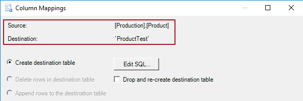 The Create destination table radio button and Edit SQL button are disabled if the destination name already exists:
