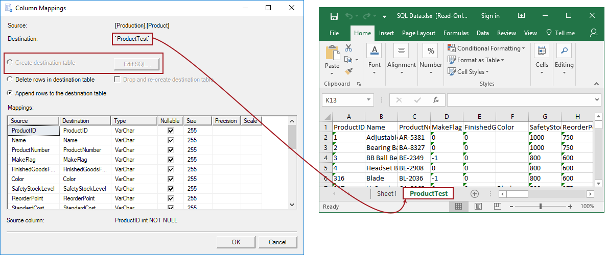 The Create destination table option, if the destination table does not exist, creates a new destination table (e.g. ProductTest).