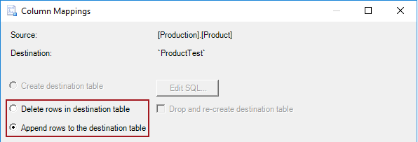 If the destination name exists the Delete rows in destination table and Append rows to destination table radio buttons are enabled: