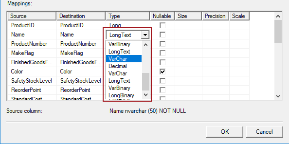 The Type column shows the data type for the destination columns. The data type can be changed by selecting other type from the combo box: