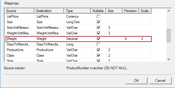 In the Precision column, the precision of the numeric data for the destination column can be specified, here can be set the number of the digits.