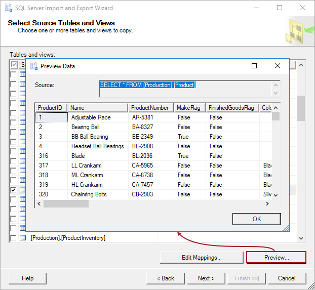 To preview data that will be copied to the destination, under the Select Source Tables and Views page, click the Preview button. This will open the Preview Data dialog box: