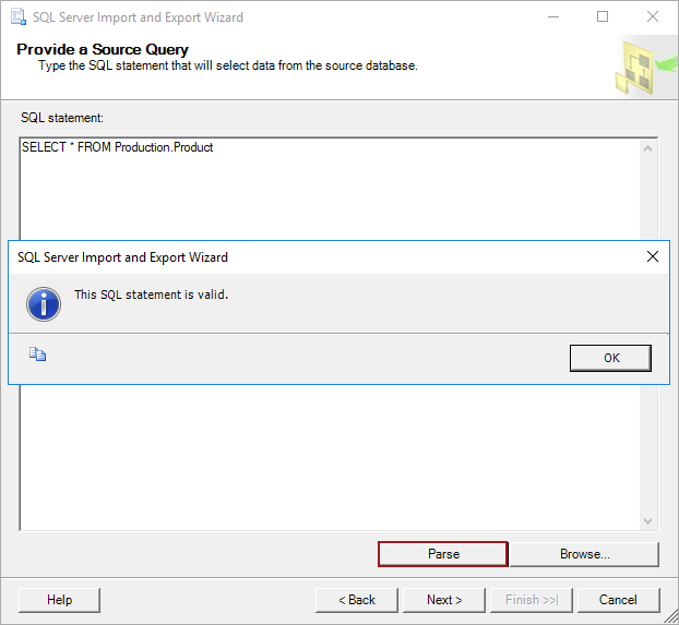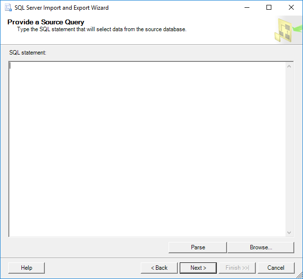 If the Write a query to specify the data to transfer radio button is chosen on the Specify Table Copy or Query page of the SQL Server Import and Export Wizard, then the Provide a Source Query dialog box will appear: