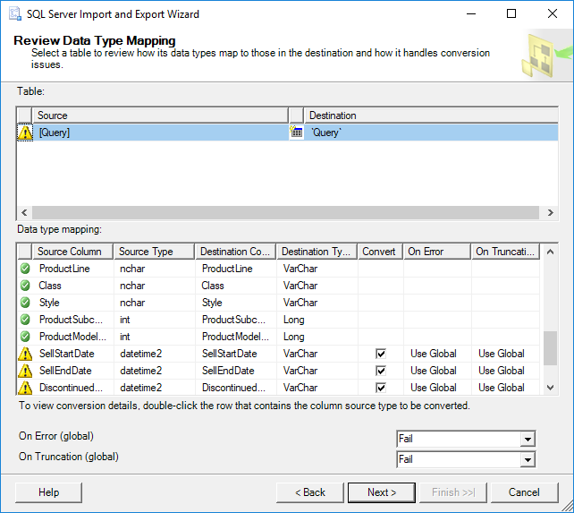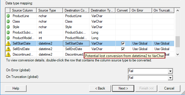 If a problem with data type conversation exists, the warning icon next to the data source in the Table list will appear and, in the Data type mapping list, the warning icons will appear next to the source columns which indicates that this conversation may cause a loss of data: