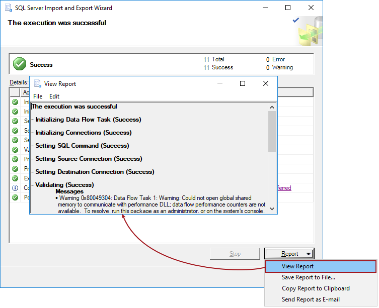 Also, when the SQL Server Import and Export Wizard is used, make sure that you have adequate permissions, otherwise one of the following messages may appear: