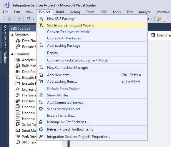 Or in Solution Explorer, right click the SSIS Packages folder and, from the context menu, choose the SSIS Import and Export Wizard option: