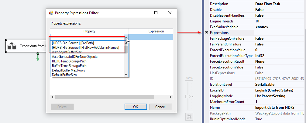 To set these properties, select the data flow task, in the properties tab, click on expression. Then, you will find a list of these properties within the Property Expressions editor form, as shown below: