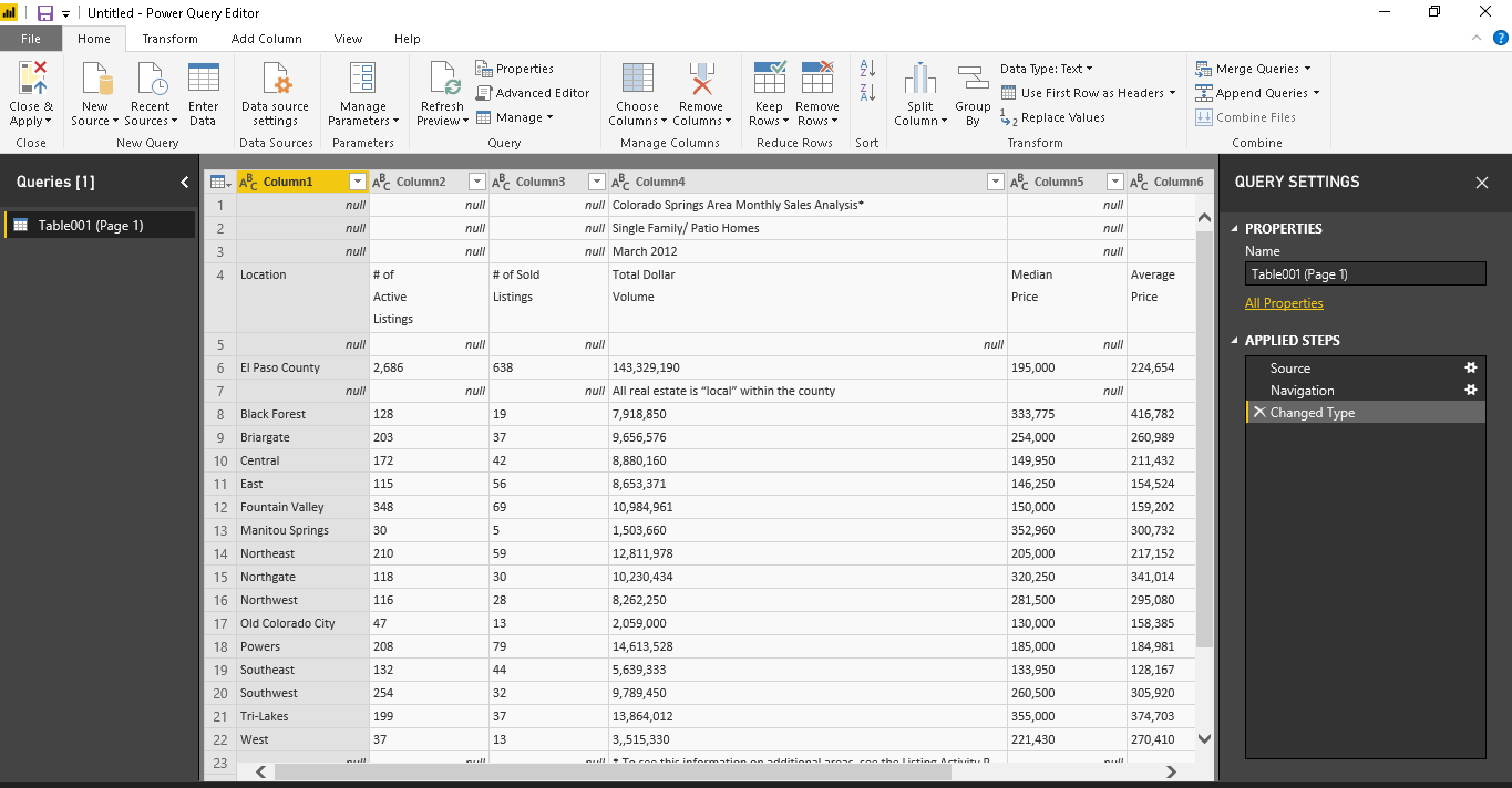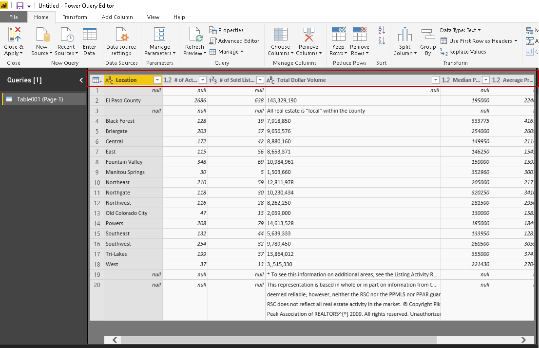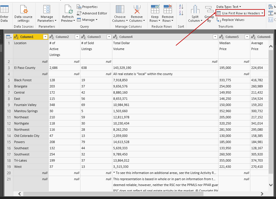 In this Power Query Editor, you can see that the fourth row contains the column names. We do not want to have the top three rows in our table. Therefore, we need to remove these three rows from the top.