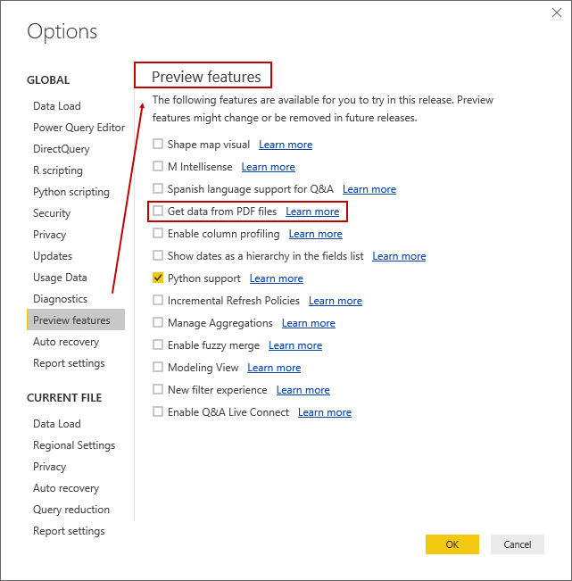 It opens various Power BI configuration options. We can configure various options such as Data load, Power BI Query, R scripting, security, Report settings. We need to click on the Preview features menu option to use the PDF connector in Power BI Desktop data source.