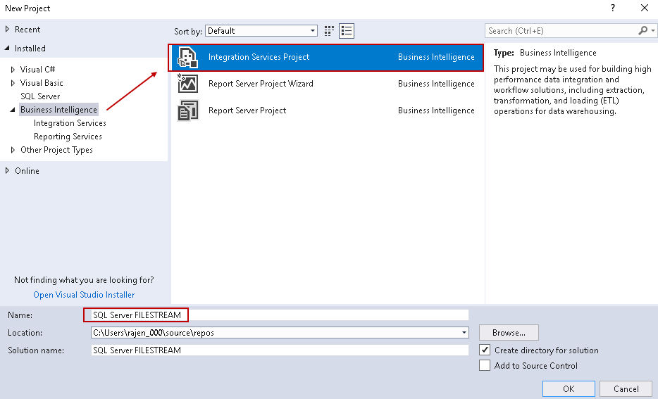 If you run the Visual Studio 2017 (SSDT) for the first time, make sure you select the layout Business intelligence. In the Business Intelligence, click on the Integration Service Project and provide the project name, location for this project.
