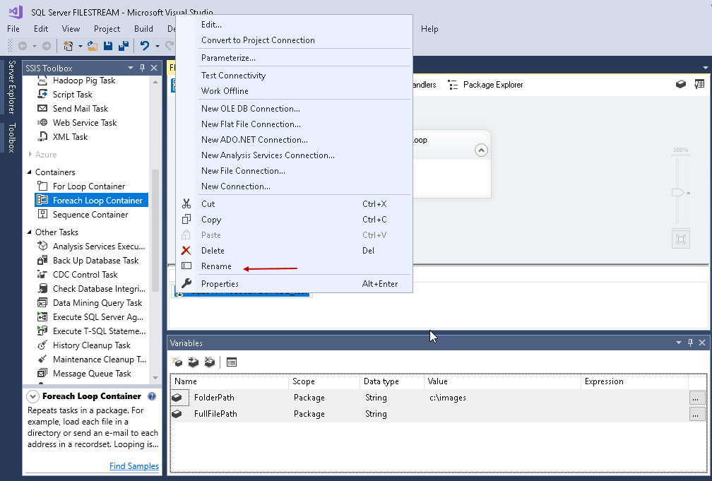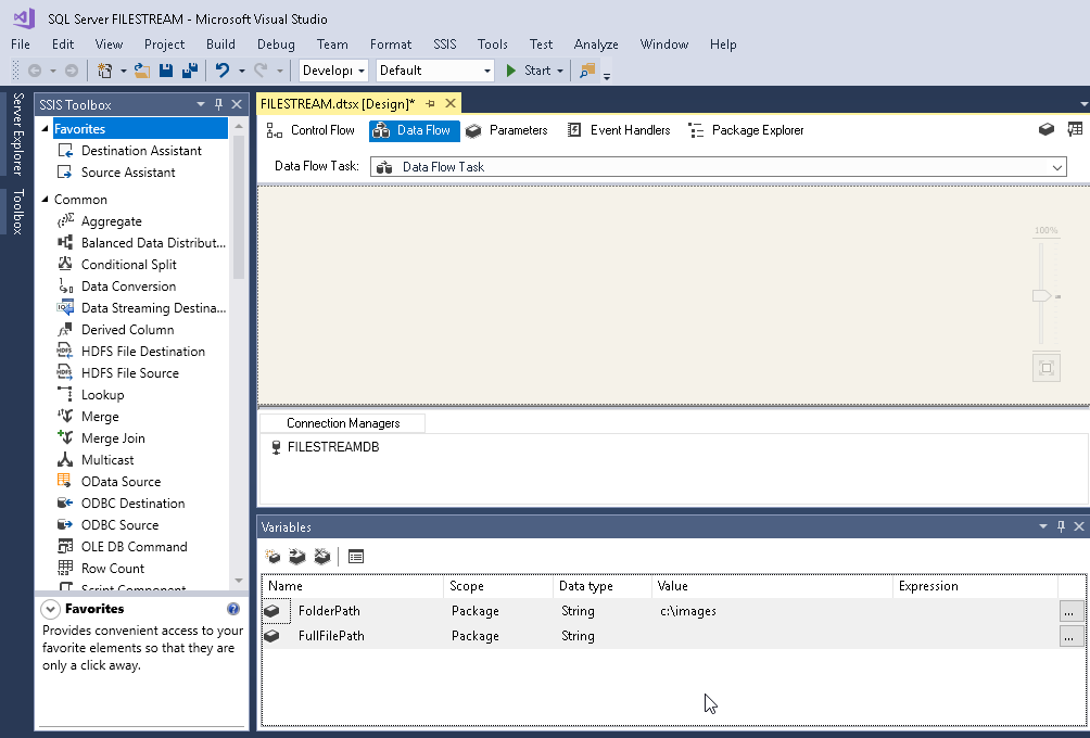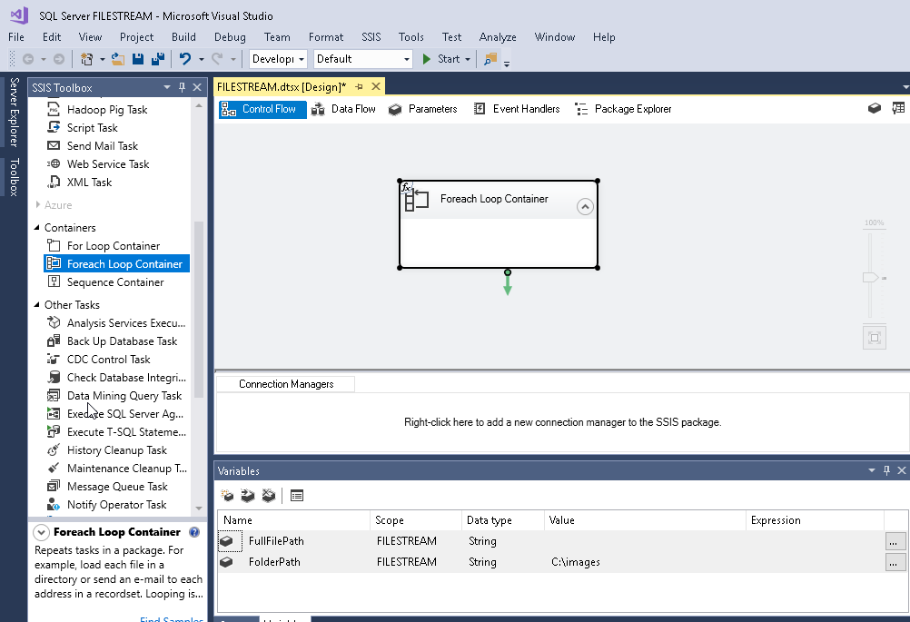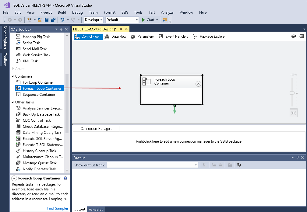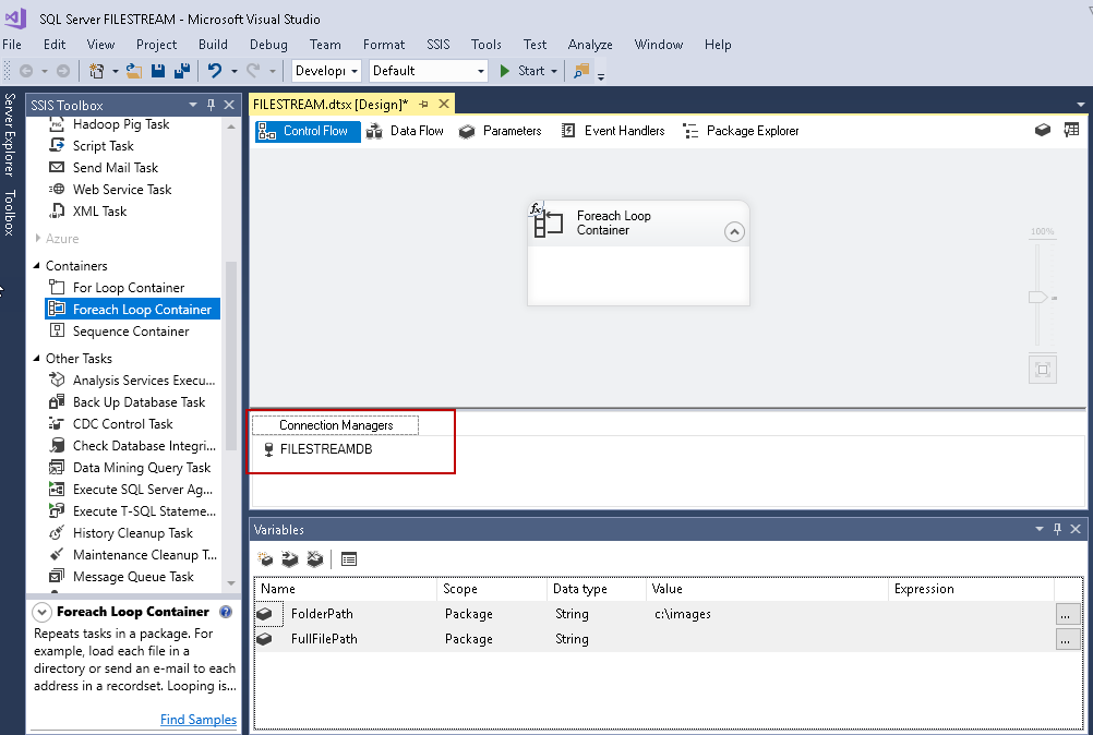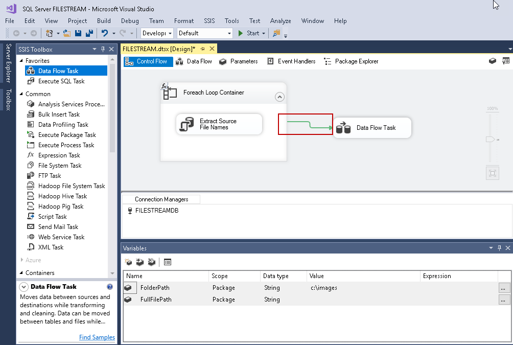 In the next step, we need to prepare a dynamic query to insert the records into the SQL Server FILESTREAM table. Add a ‘Data Flow Task’ outside the container as shown here.