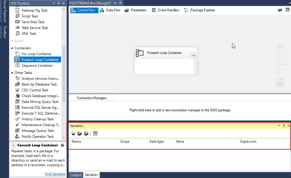 Right click on the blank area in the control flow and click on Variables. It opens the ‘Variables’ window as shown here.