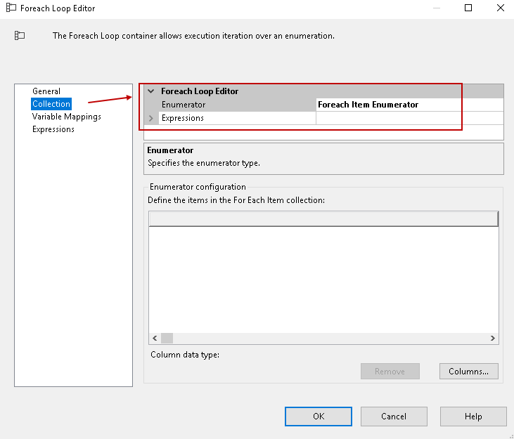 Click on the ‘Collection’. By default, it shows the Enumerator ‘Foreach Item Enumerator’