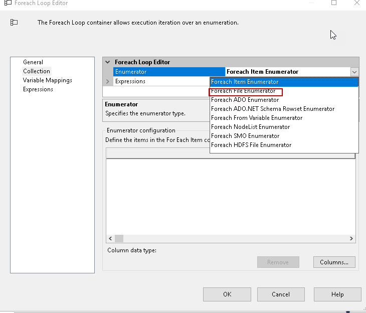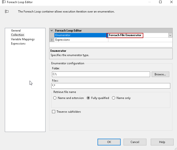 We need to select the enumerator ‘Foreach File Enumerator’ from the drop-down menu.