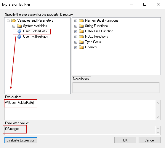 Drag the variable ‘User: FolderPath’ to the ‘Expression’ window and click on ‘Evaluate Expression’. You can see the source folder name in the ‘Evaluated value’.