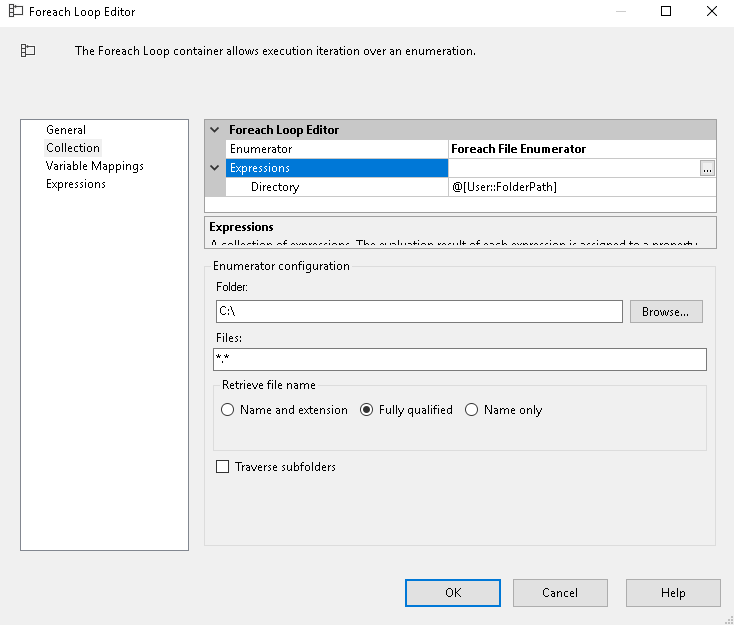 We configured the ‘Foreach loop Container’ to loop through the source folder and put the result (fully qualified name) into a variable.