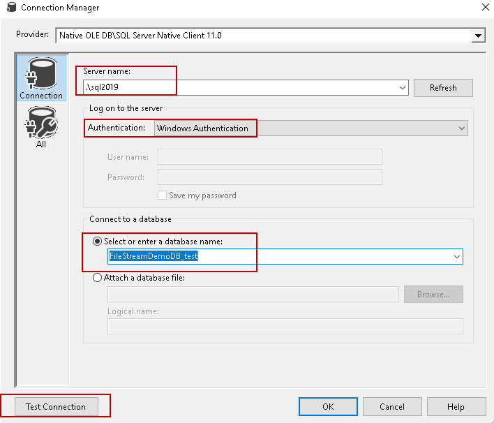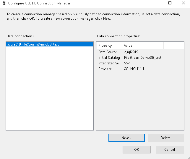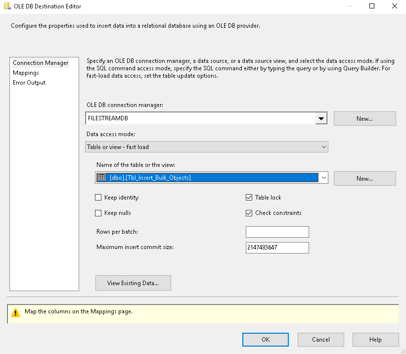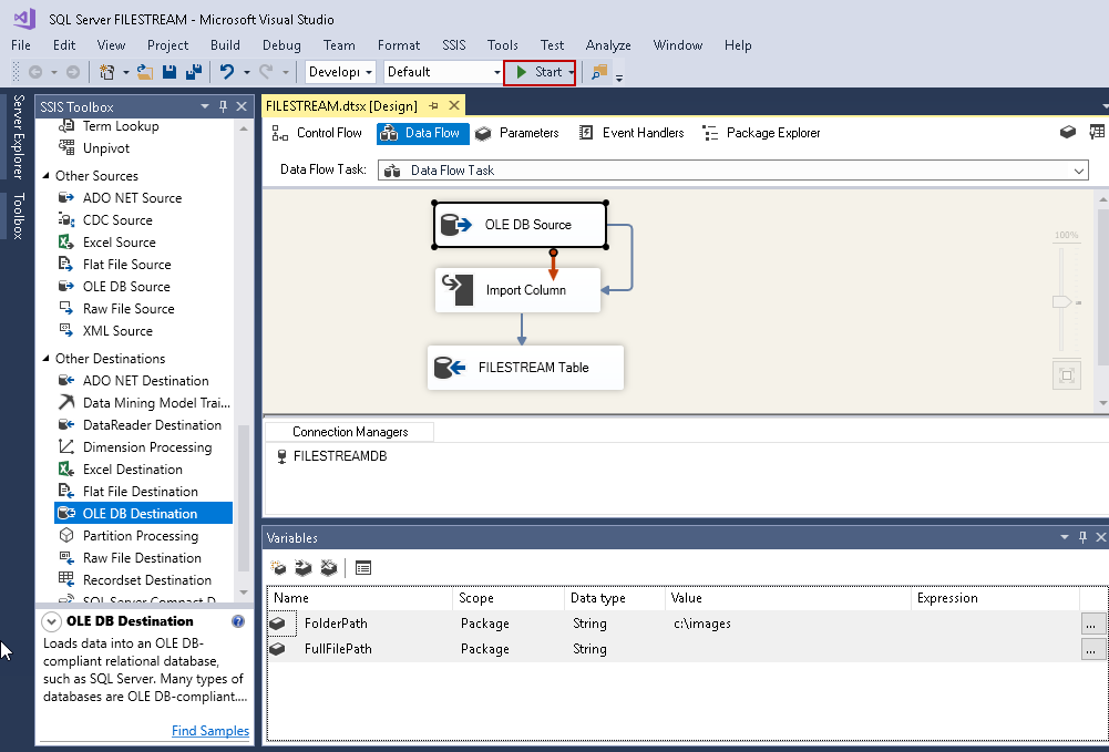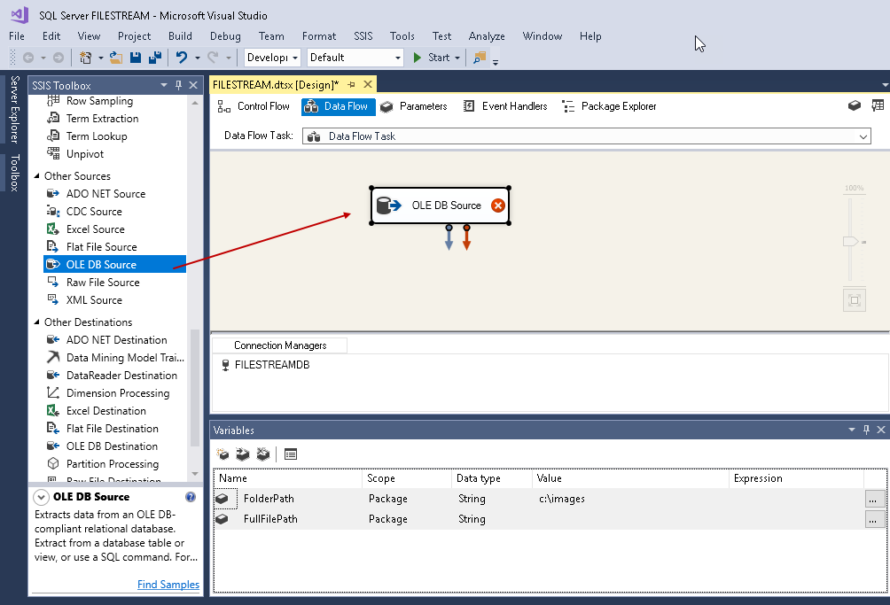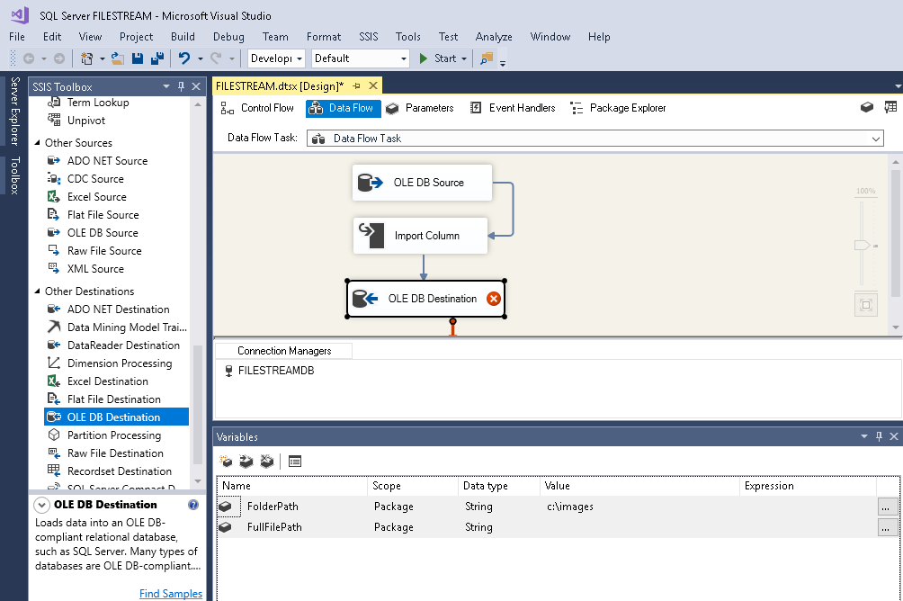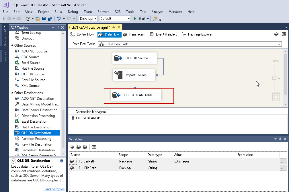 Click ‘OK’ and add an ‘OLE DB destination’ in the package. This OLE destination will point to the FILESTREAM table.