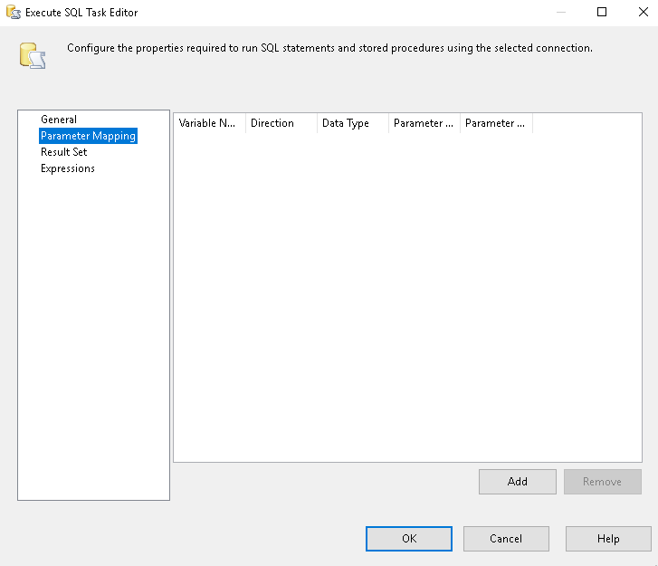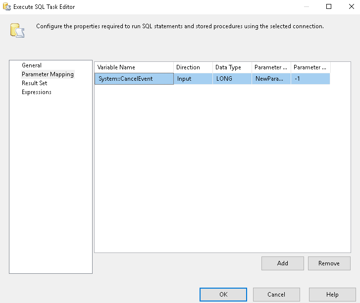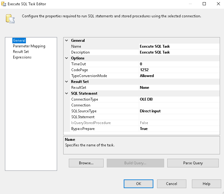 Double click on the ‘Execute SQL Task’ to open the execute SQL task editor window.