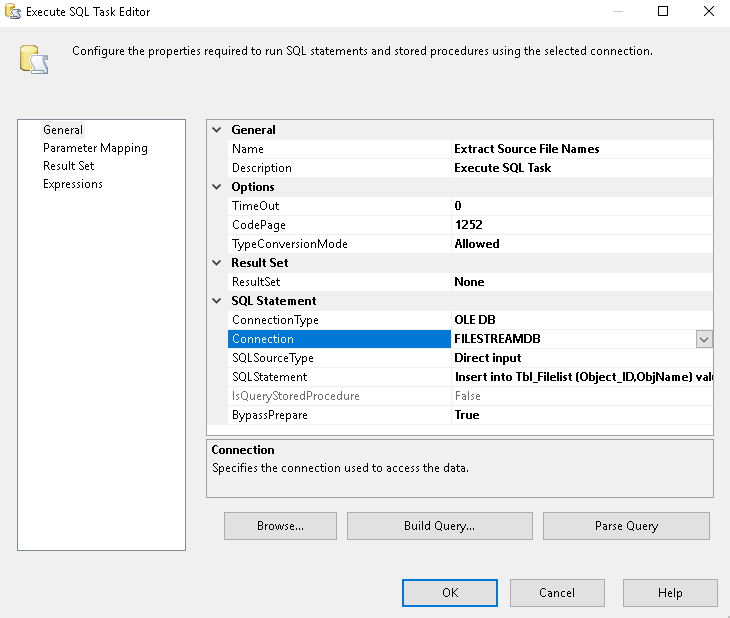 - SQL Statement: Enter the below query to insert the FILE full qualified names and unique ID in the table we created earlier, in the ObjName you can see value as ‘?’, it will be replaced by the result set variable in the run time