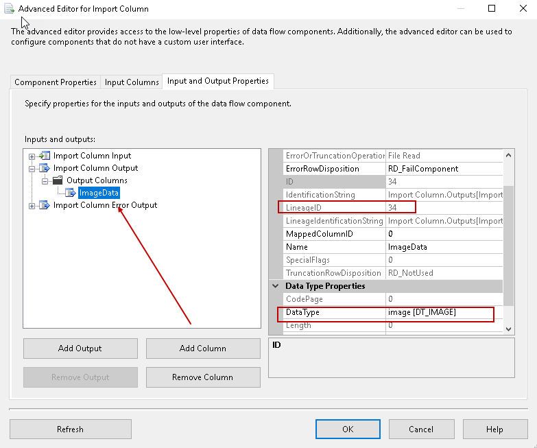 You need to note down this LineageID, and we will specify it to connect the input and the output. Now, will link both the Import column output and Import Column input using the LeneageID.