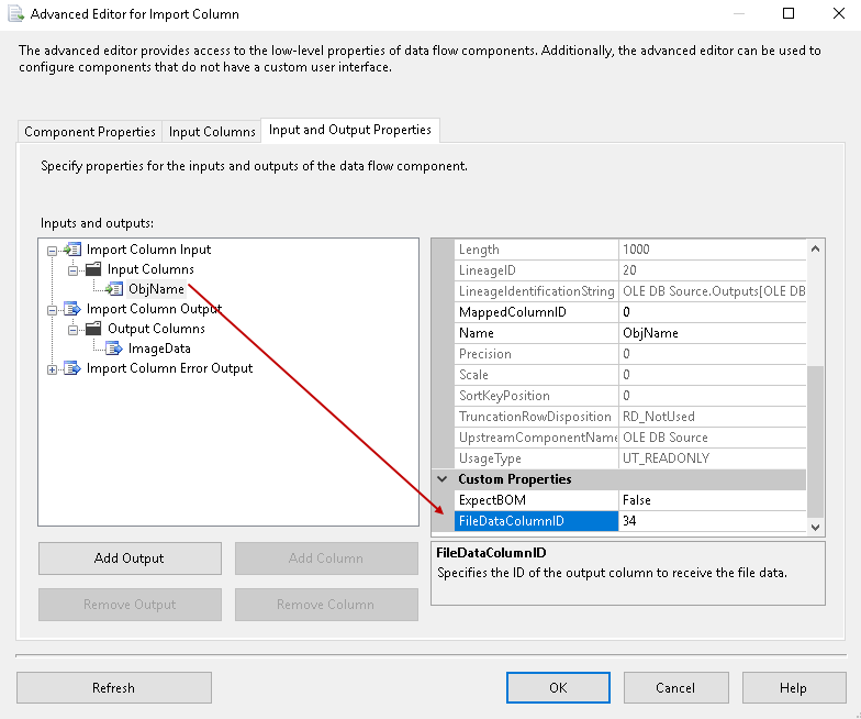 Expand the ‘Import Columns Input’ and click on the input column name. In the ‘FileDataColumnID’ enter the lineage ID as shown below.