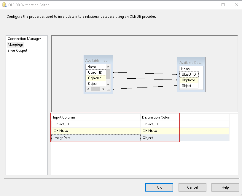 Click on the ‘Mapping’. In the mapping, select the input and the output columns. In this case, we will select new column ‘ImageData’ for the Object destination which is a FILESTREAM column.
