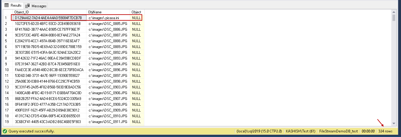 - Verify the SQL Server FILESTREAM table: In the below screenshot, we have 324 records in the FILESTREAM table as well. It shows that we have successfully inserted all records into this table