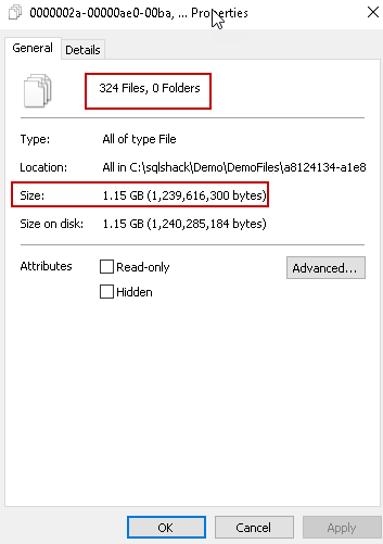 - Verify the files in the FILESTREAM Container: let us go to the FILESTREAM container and check the count of files and their total size. We have 324 files in this FILESTREAM container as well, and total size matches with the source folder size.