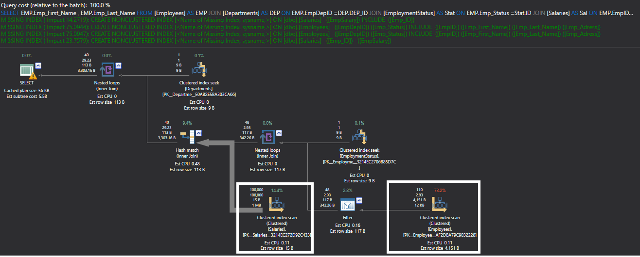 Let us create the below two indexes that include the foreign key columns on both the Employees and Salaries tables using the T-SQL script below: