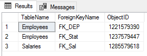 • Retrieve all foreign keys from all database tables by querying the sys.foreign_keys system object and fill its information in the #TempForeignKeys temp table.