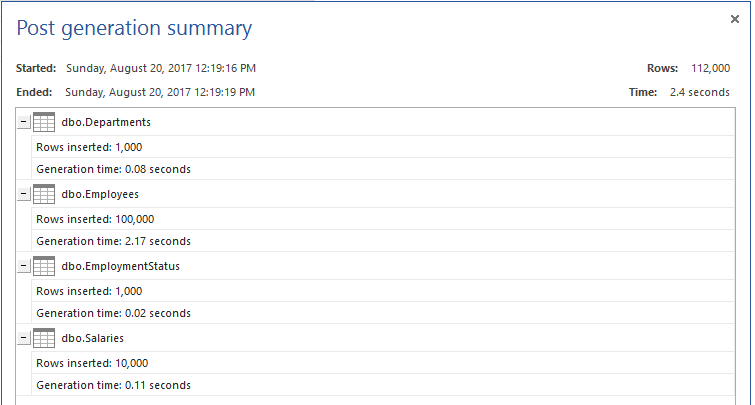 The tables are created successfully now. To have a fair testing scenario, we will fill these tables with testing data using ApexSQL Generate as shown below: