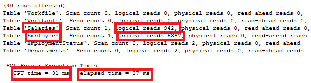 The IO statistics generated by running the previous query shows that 942 logical reads performed on the Salaries table and 5387 logical reads performed on the Employees table to retrieve the requested data. The previous query took 37ms to execute completely, consuming 31ms from the CPU time as shown below:
