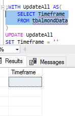 ALTER TABLE tbAlmondData ADD Timeframe VARCHAR(9) ;WITH UpdateAll AS( SELECT Timeframe FROM tbAlmondData ) UPDATE UpdateAll SET Timeframe = ''