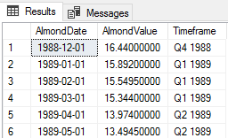Next, we’ll create a quarter table that we’ll use for an update CTE in SQL Server, with a join and insert four records. For our update, we’ll join our tbAlmondData to our newly created QuarterTable on the quarter part of the AlmonddDate (we could run this update by using the DATEPART function alone, but this example will also show how we can use a join statement to make updating easy with SQL CTEs). We want our new timeframe column to hold the value of QN YYYY, such as Q1 1989. For our select statement inside the common table expression, we’ll select our Timeframe column (which will need to be updated) as well as the varchar combination of QuarterValue and casted year of our AlmondDate column as a varchar of size four. We can check how the existing Timeframe column and how the NewTimeframe column look before we run the update.