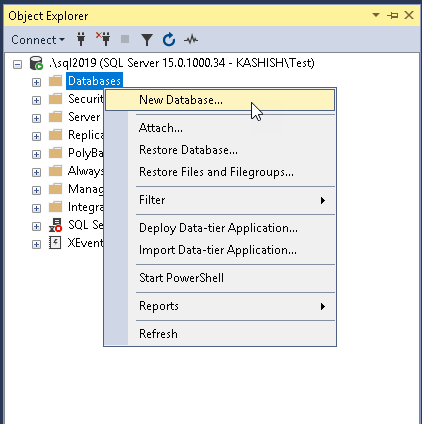 In this article, first, we will be creating a FILESTREAM enabled SQL Server database. To do this, connect to the database instance and right click on ‘Databases’ and then ‘New Database’ to create a new FILESTREAM database.