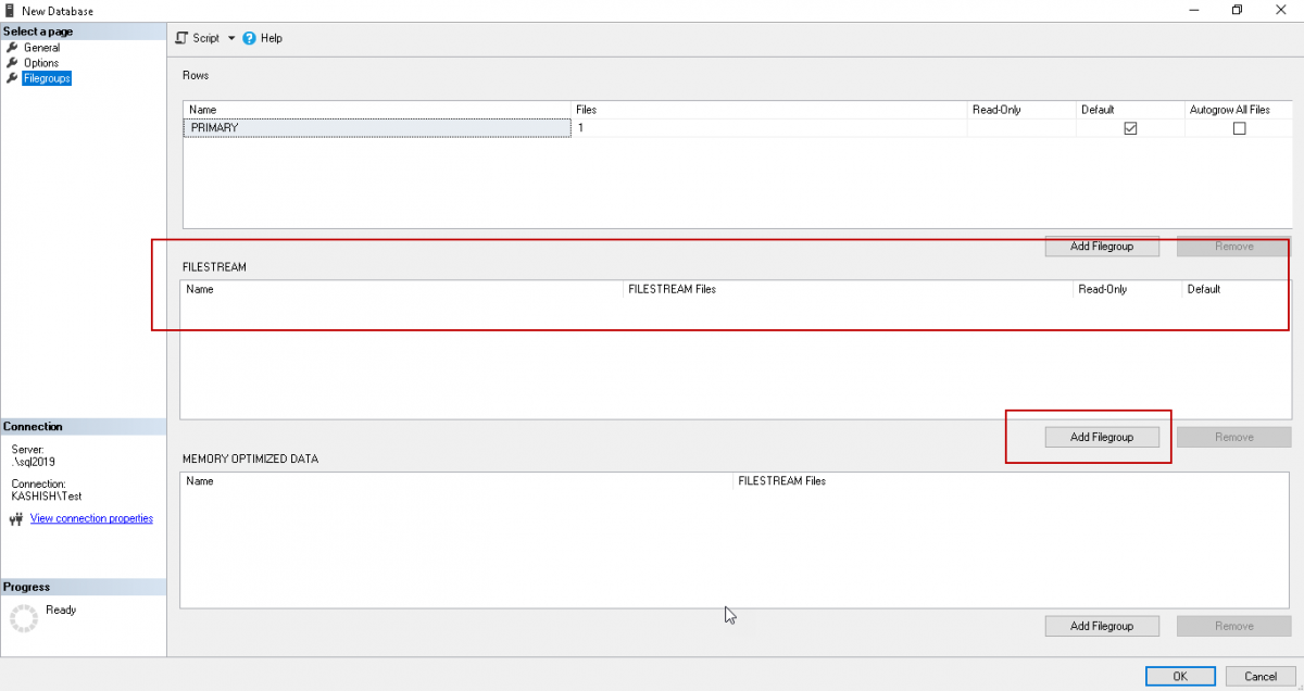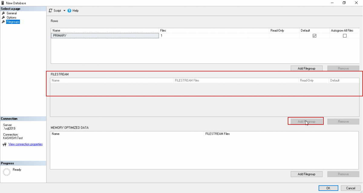 Click on ‘Add FileGroup’ in the FILESTREAM section and specify the name of the SQL Server FILESTREAM filegroup.