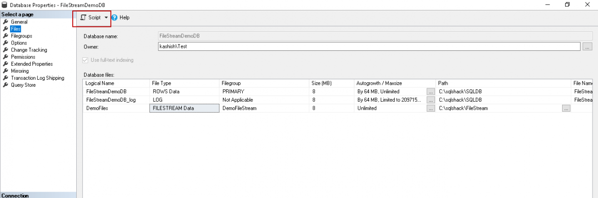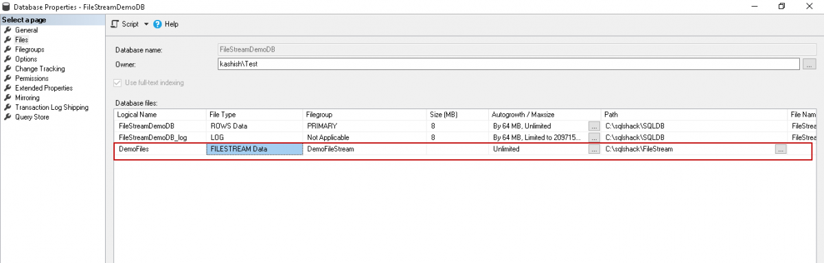 Click ‘OK’ to create the database with this new filegroup. Once the database is created, open the database properties to add the file in the newly created ‘DemoFileStream’ filegroup.