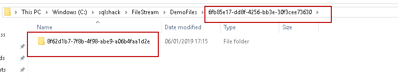 Now if we look at the FILESTREAM path, we can see a new folder with GUID values.