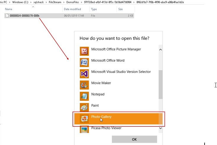We will insert the data in the newly created FILESTREAM table. In this example, we will insert a picture which is located at the ‘C:\sqlshack’ folder.